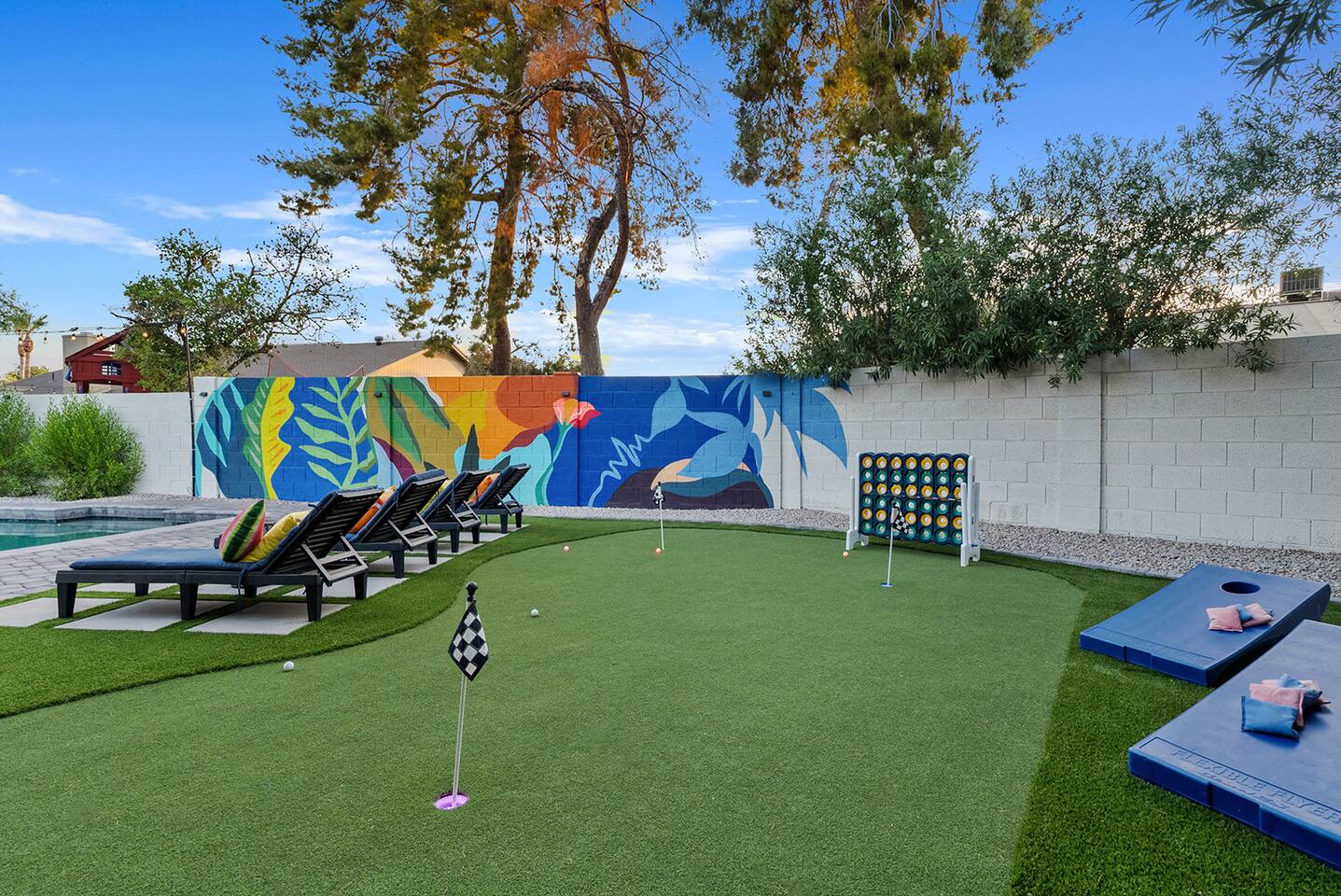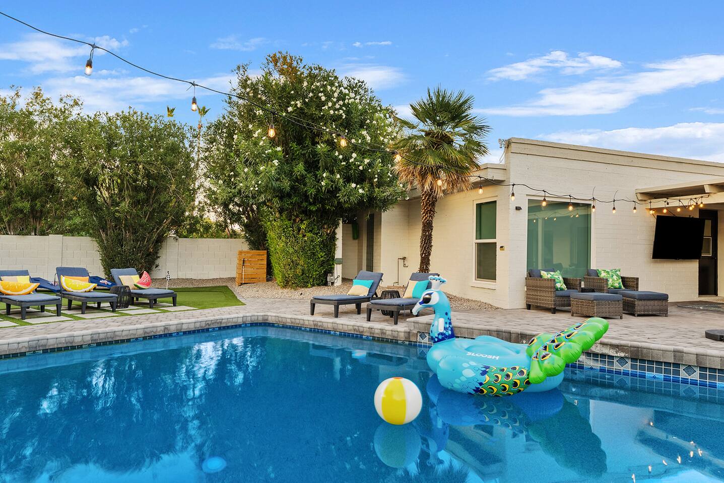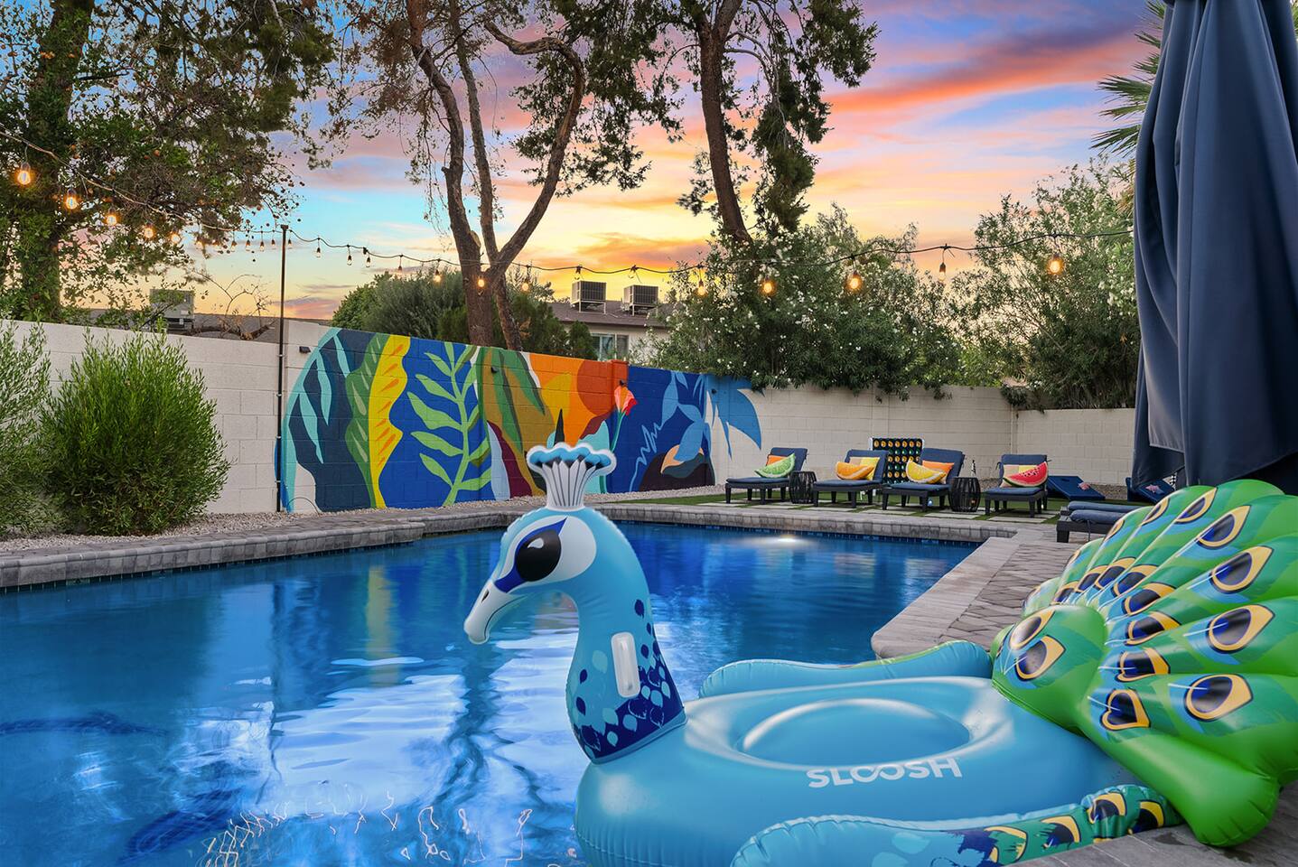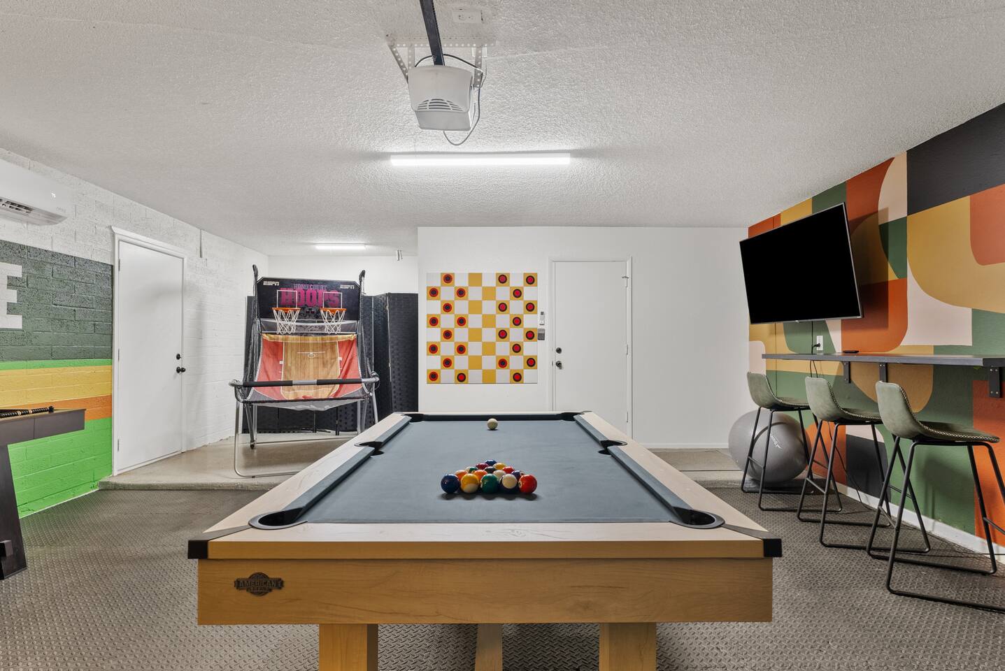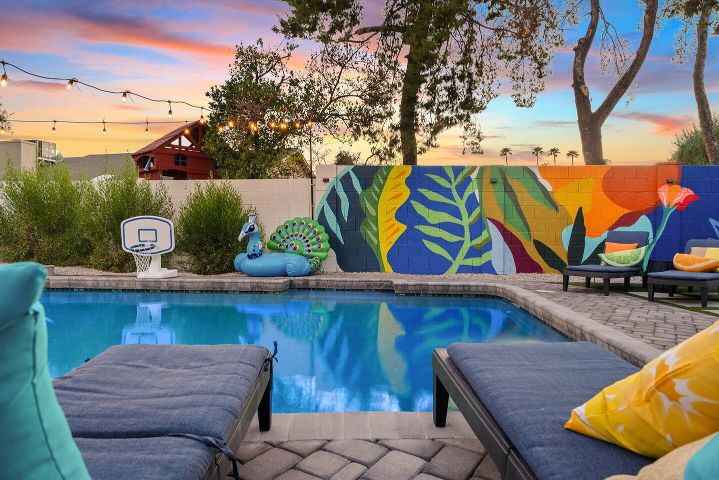 ✔ Heated Pool + Hot Tub ✔ Backyard Movie Nights (75” TV!) ✔ Giant Yard Games, Putting Green & Outdoor Dining ✔ Game Room w/ Shuffleboard, Pool Table+ Giant Checkers + Basketball Shootout ✔ Kid-friendly touches (bunk beds, toys, baby gear) ✔ Treadmill, Keurig, Pour-over, Fast Wi-Fi & Smart TVs in every room Inside, you'll find a bright, modern home designed for comfort and connection — with a luxury kitchen, cozy living room, and beds so comfy even adults rave about the sheets. ☀️ The Backyard This is the wow factor — and where you’ll spend 90% of your time! Dive into the heated pool, soak in the spa, grill up dinner, then catch a movie under the stars. There's room for everyone to spread out and relax, play, or cheer on the big game. 🏓 Games Galore Pool Table, shuffleboard, classic arcade, cornhole, Connect 4, Jenga — rain or shine, there's always something fun to do. 🛏 4 Bedrooms | Sleeps up to 10 • King Suite w/ ensuite bath • 2 Queen Bedrooms • 1 Bunk Room (twin over full) — perfect for kiddos! 👶 Family Friendly High chair, pack ’n play, baby monitor, kids dinnerware — all the essentials are covered so you can pack light and play hard. 🍽 Fully Stocked Kitchen From pancake mornings to taco nights, the kitchen is loaded with everything you need (and probably forgot you’d want): air fryer, blender, Fellow pour-over, spices, baking gear, and more. 📍Location, Location Dobson Ranch is a peaceful, established neighborhood with tree-lined streets, walking paths, and community amenities like pickleball. You’re just: • 5 min to groceries, restaurants & parks • 10 min to Chandler & Downtown Gilbert • 15 min to Spring Training & Tempe • 20 min to Sky Harbor & Old Town Scottsdale 🧼 Clean & Thoughtful Guests love our attention to detail — from the sparkling pool to the plush linens to the easy check-in and responsive hosting. We've thought of everything so you don’t have to. Whether you're escaping the cold, planning a family reunion, or just need some desert sunshine — this Mesa retreat is ready when you are.