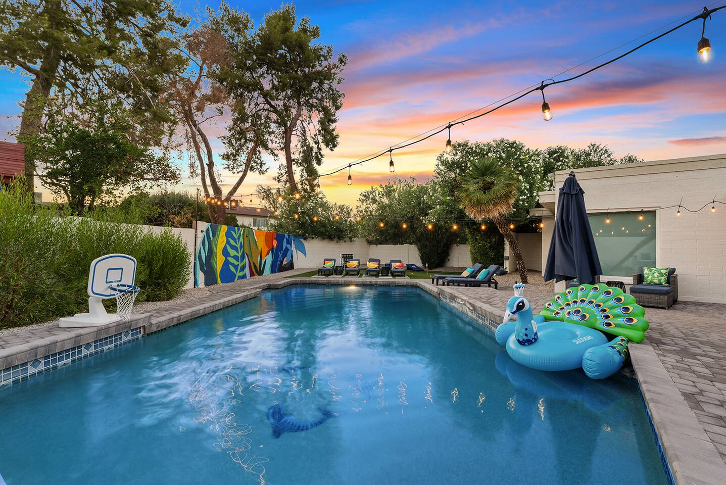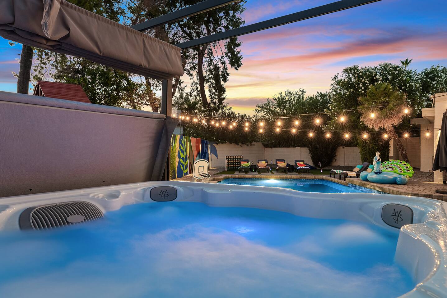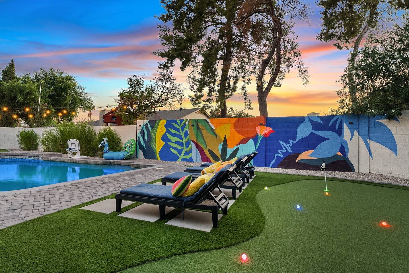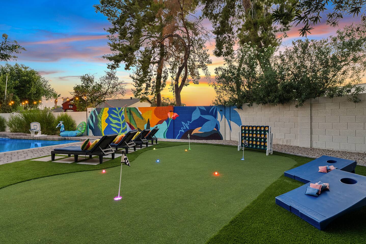 ✔ Heated Pool + Hot Tub ✔ Backyard Movie Nights (75” TV!) ✔ Giant Yard Games, Putting Green & Outdoor Dining ✔ Game Room w/ Shuffleboard, Pool Table+ Giant Checkers + Basketball Shootout ✔ Kid-friendly touches (bunk beds, toys, baby gear) ✔ Treadmill, Keurig, Pour-over, Fast Wi-Fi & Smart TVs in every room Inside, you'll find a bright, modern home designed for comfort and connection — with a luxury kitchen, cozy living room, and beds so comfy even adults rave about the sheets. ☀️ The Backyard This is the wow factor — and where you’ll spend 90% of your time! Dive into the heated pool, soak in the spa, grill up dinner, then catch a movie under the stars. There's room for everyone to spread out and relax, play, or cheer on the big game. 🏓 Games Galore Pool Table, shuffleboard, classic arcade, cornhole, Connect 4, Jenga — rain or shine, there's always something fun to do. 🛏 4 Bedrooms | Sleeps up to 10 • King Suite w/ ensuite bath • 2 Queen Bedrooms • 1 Bunk Room (twin over full) — perfect for kiddos! 👶 Family Friendly High chair, pack ’n play, baby monitor, kids dinnerware — all the essentials are covered so you can pack light and play hard. 🍽 Fully Stocked Kitchen From pancake mornings to taco nights, the kitchen is loaded with everything you need (and probably forgot you’d want): air fryer, blender, Fellow pour-over, spices, baking gear, and more. 📍Location, Location Dobson Ranch is a peaceful, established neighborhood with tree-lined streets, walking paths, and community amenities like pickleball. You’re just: • 5 min to groceries, restaurants & parks • 10 min to Chandler & Downtown Gilbert • 15 min to Spring Training & Tempe • 20 min to Sky Harbor & Old Town Scottsdale 🧼 Clean & Thoughtful Guests love our attention to detail — from the sparkling pool to the plush linens to the easy check-in and responsive hosting. We've thought of everything so you don’t have to. Whether you're escaping the cold, planning a family reunion, or just need some desert sunshine — this Mesa retreat is ready when you are.