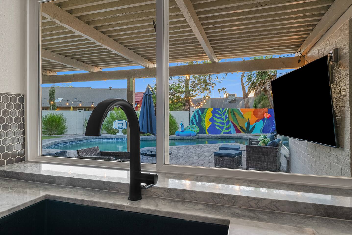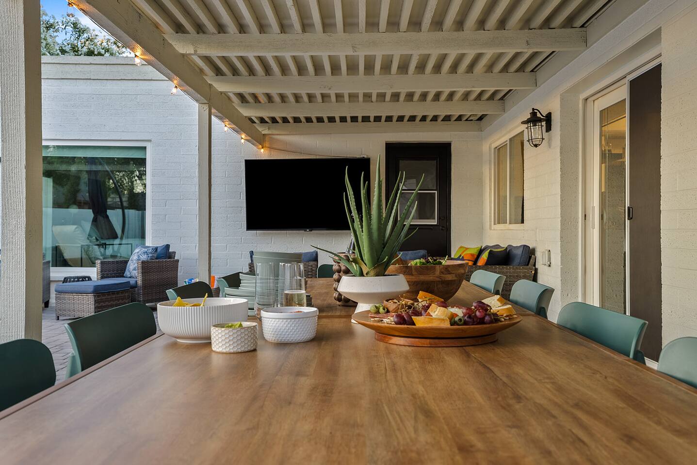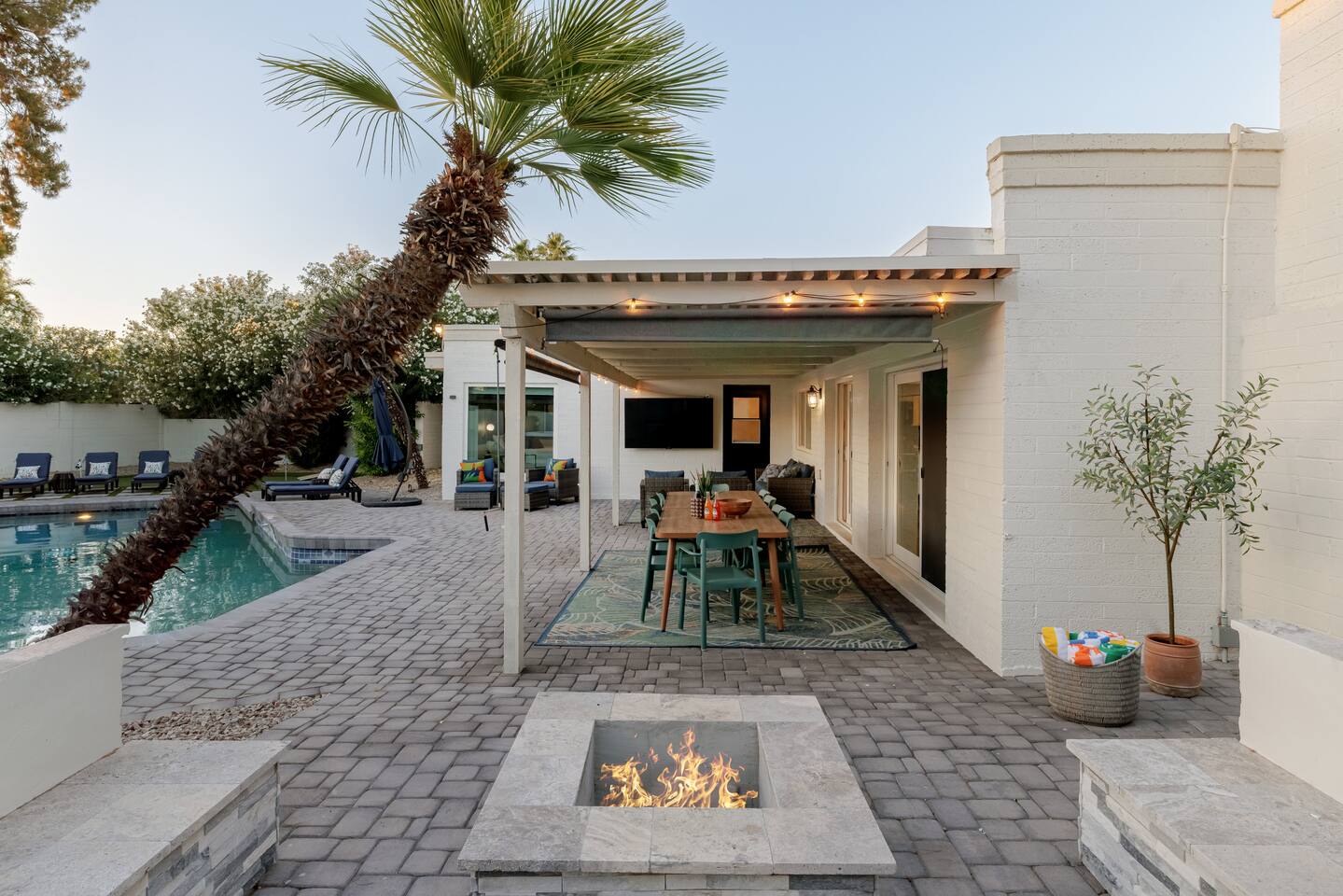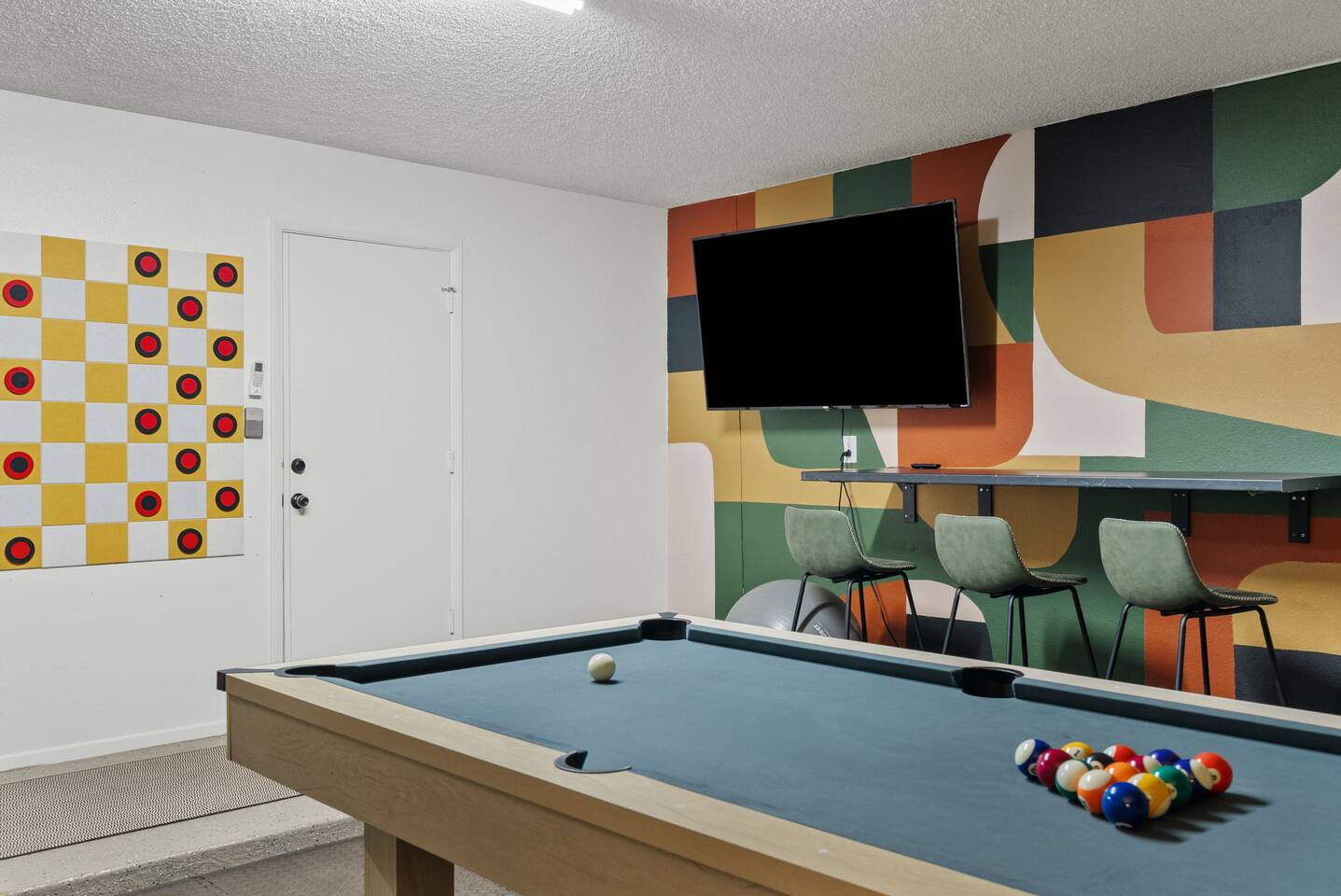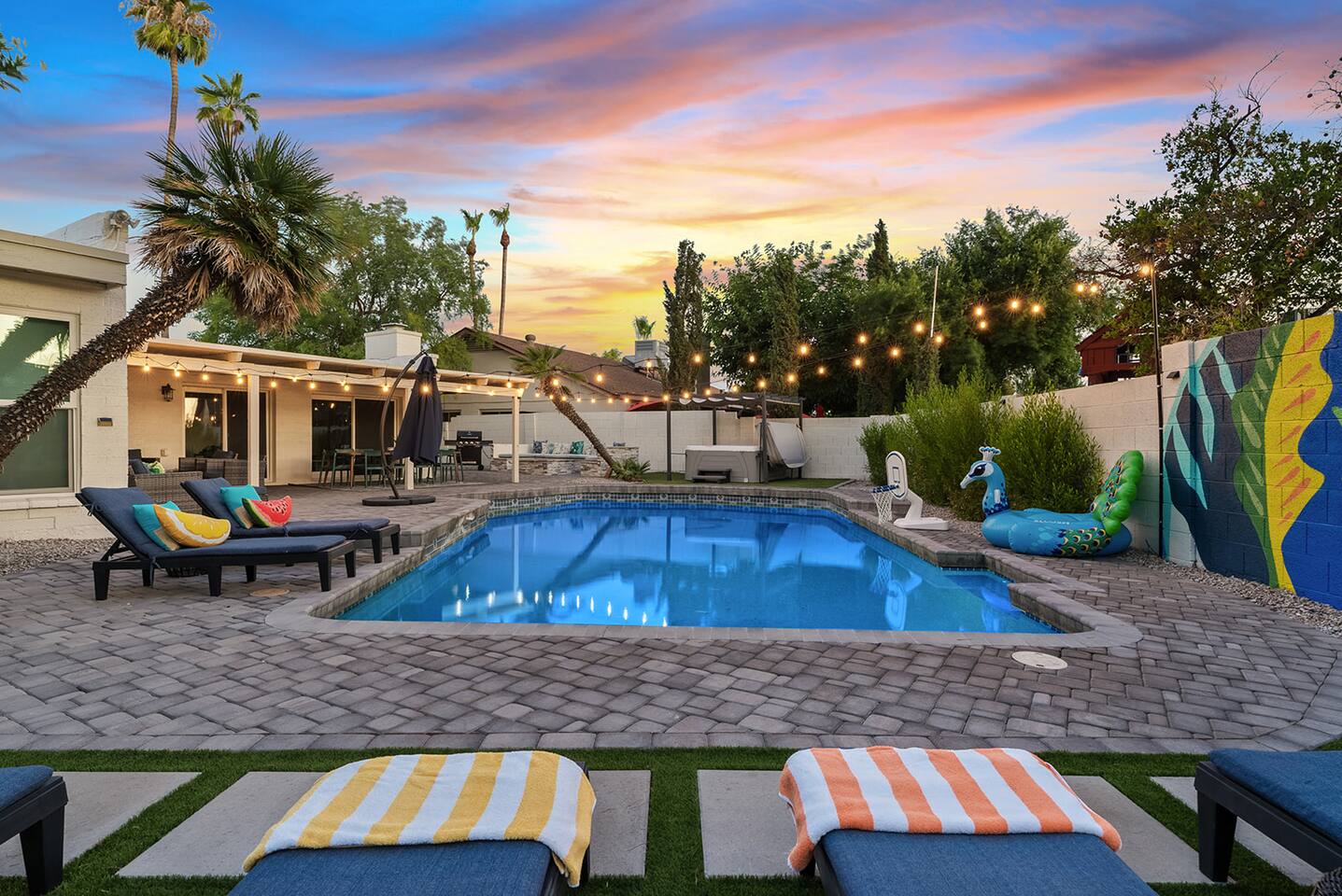 ✔ Heated Pool + Hot Tub ✔ Backyard Movie Nights (75” TV!) ✔ Giant Yard Games, Putting Green & Outdoor Dining ✔ Game Room w/ Shuffleboard, Pool Table+ Giant Checkers + Basketball Shootout ✔ Kid-friendly touches (bunk beds, toys, baby gear) ✔ Treadmill, Keurig, Pour-over, Fast Wi-Fi & Smart TVs in every room Inside, you'll find a bright, modern home designed for comfort and connection — with a luxury kitchen, cozy living room, and beds so comfy even adults rave about the sheets. ☀️ The Backyard This is the wow factor — and where you’ll spend 90% of your time! Dive into the heated pool, soak in the spa, grill up dinner, then catch a movie under the stars. There's room for everyone to spread out and relax, play, or cheer on the big game. 🏓 Games Galore Pool Table, shuffleboard, classic arcade, cornhole, Connect 4, Jenga — rain or shine, there's always something fun to do. 🛏 4 Bedrooms | Sleeps up to 10 • King Suite w/ ensuite bath • 2 Queen Bedrooms • 1 Bunk Room (twin over full) — perfect for kiddos! 👶 Family Friendly High chair, pack ’n play, baby monitor, kids dinnerware — all the essentials are covered so you can pack light and play hard. 🍽 Fully Stocked Kitchen From pancake mornings to taco nights, the kitchen is loaded with everything you need (and probably forgot you’d want): air fryer, blender, Fellow pour-over, spices, baking gear, and more. 📍Location, Location Dobson Ranch is a peaceful, established neighborhood with tree-lined streets, walking paths, and community amenities like pickleball. You’re just: • 5 min to groceries, restaurants & parks • 10 min to Chandler & Downtown Gilbert • 15 min to Spring Training & Tempe • 20 min to Sky Harbor & Old Town Scottsdale 🧼 Clean & Thoughtful Guests love our attention to detail — from the sparkling pool to the plush linens to the easy check-in and responsive hosting. We've thought of everything so you don’t have to. Whether you're escaping the cold, planning a family reunion, or just need some desert sunshine — this Mesa retreat is ready when you are.