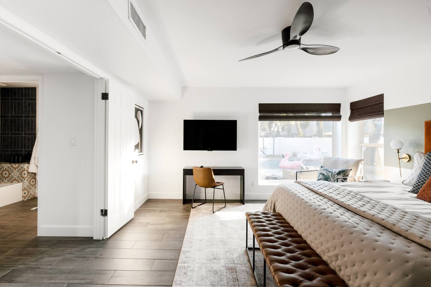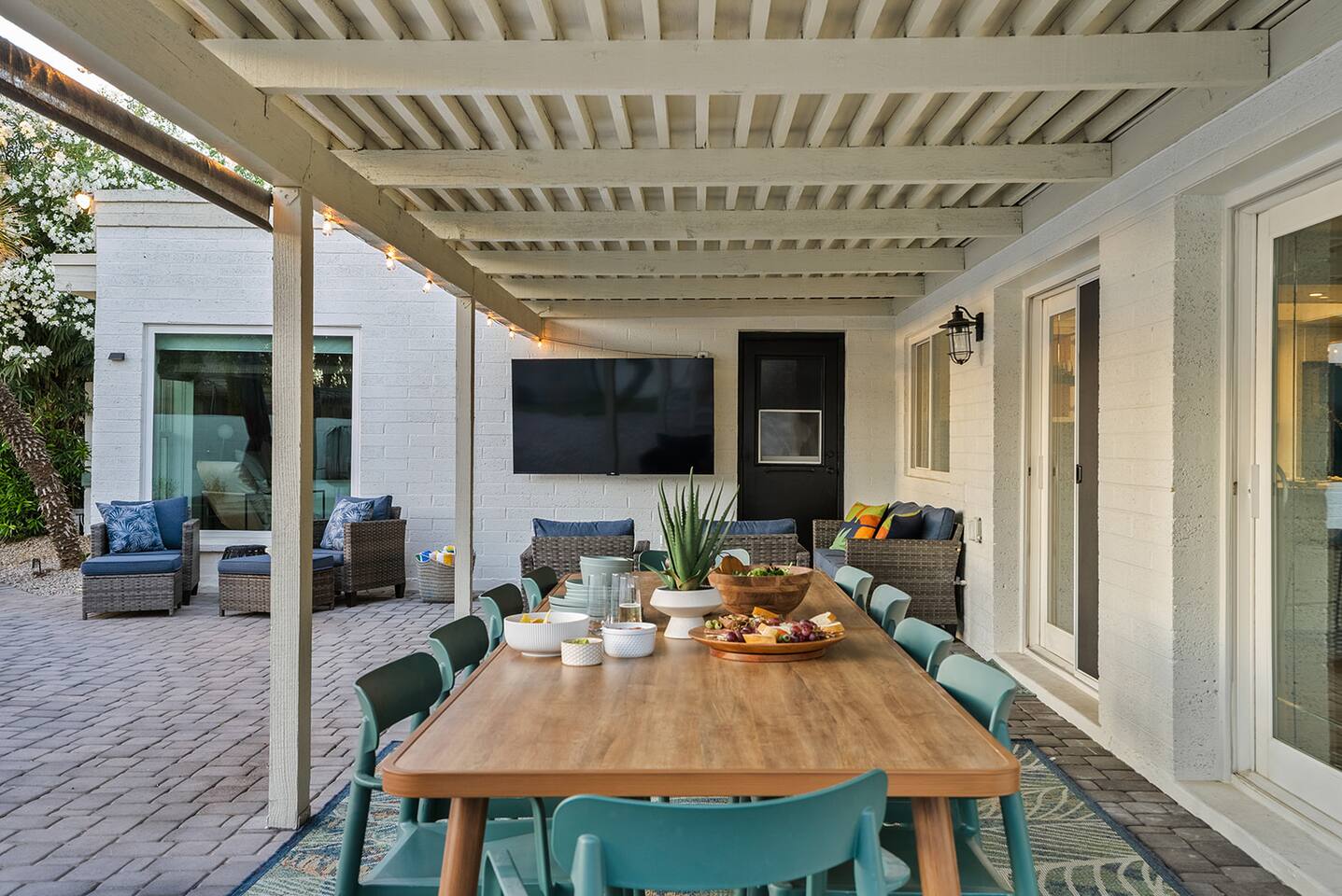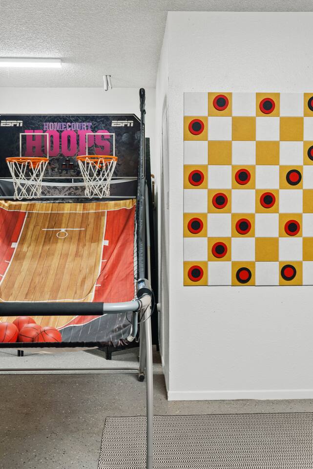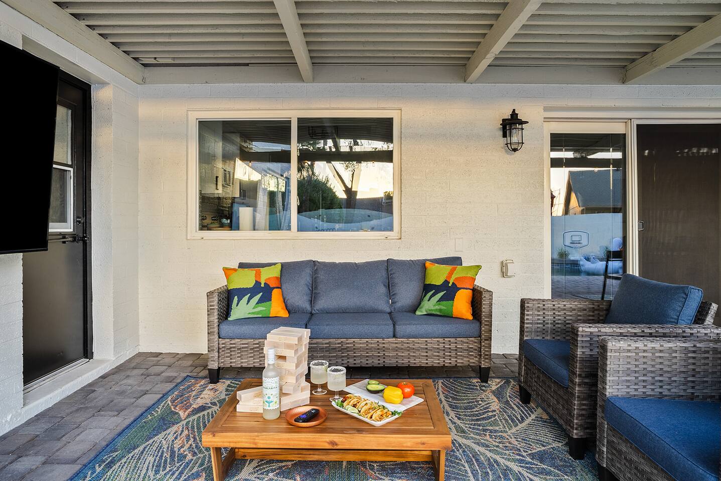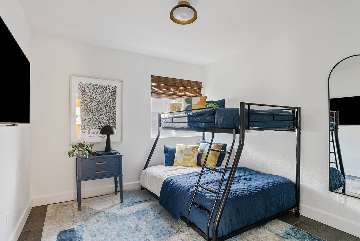 ✔ Heated Pool + Hot Tub ✔ Backyard Movie Nights (75” TV!) ✔ Giant Yard Games, Putting Green & Outdoor Dining ✔ Game Room w/ Shuffleboard, Pool Table+ Giant Checkers + Basketball Shootout ✔ Kid-friendly touches (bunk beds, toys, baby gear) ✔ Treadmill, Keurig, Pour-over, Fast Wi-Fi & Smart TVs in every room Inside, you'll find a bright, modern home designed for comfort and connection — with a luxury kitchen, cozy living room, and beds so comfy even adults rave about the sheets. ☀️ The Backyard This is the wow factor — and where you’ll spend 90% of your time! Dive into the heated pool, soak in the spa, grill up dinner, then catch a movie under the stars. There's room for everyone to spread out and relax, play, or cheer on the big game. 🏓 Games Galore Pool Table, shuffleboard, classic arcade, cornhole, Connect 4, Jenga — rain or shine, there's always something fun to do. 🛏 4 Bedrooms | Sleeps up to 10 • King Suite w/ ensuite bath • 2 Queen Bedrooms • 1 Bunk Room (twin over full) — perfect for kiddos! 👶 Family Friendly High chair, pack ’n play, baby monitor, kids dinnerware — all the essentials are covered so you can pack light and play hard. 🍽 Fully Stocked Kitchen From pancake mornings to taco nights, the kitchen is loaded with everything you need (and probably forgot you’d want): air fryer, blender, Fellow pour-over, spices, baking gear, and more. 📍Location, Location Dobson Ranch is a peaceful, established neighborhood with tree-lined streets, walking paths, and community amenities like pickleball. You’re just: • 5 min to groceries, restaurants & parks • 10 min to Chandler & Downtown Gilbert • 15 min to Spring Training & Tempe • 20 min to Sky Harbor & Old Town Scottsdale 🧼 Clean & Thoughtful Guests love our attention to detail — from the sparkling pool to the plush linens to the easy check-in and responsive hosting. We've thought of everything so you don’t have to. Whether you're escaping the cold, planning a family reunion, or just need some desert sunshine — this Mesa retreat is ready when you are.