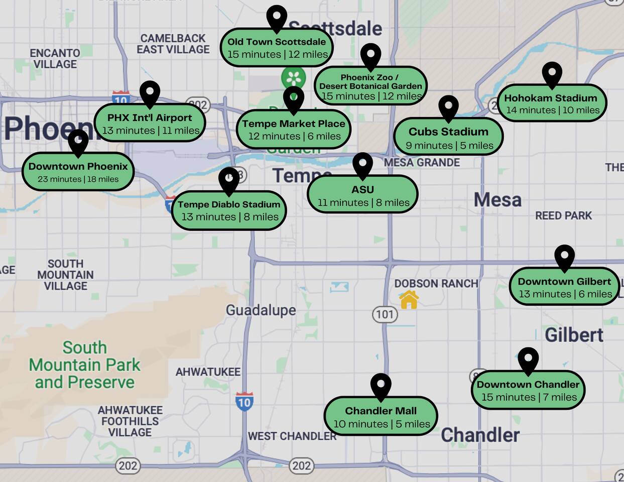 The house is nestled right on the border of Mesa and Tempe, just 10-mins away from the Cubs Spring Training stadium! It's super close to the freeways and surrounded by many dining options, major shopping, and venues like Casino Arizona, Top Golf, Mill Avenue, Butterfly Wonderland, OdySea Aquarium, Phoenix Zoo, Botanical Gardens, and many others! Also just 15 minutes to the airport Here are some places of interest you'll surely be looking to visit during your stay: ✔ Old Town Scottsdale (13 min away) ✔ Downtown Gilbert (12 min away) ✔ Downtown Chandler (14 min away) ✔ Golfland Sunsplash (8 min away) ✔ Sloan Park (10 min away) ✔ SEA LIFE Arizona Aquarium (10 min away) ✔ LEGOLAND Discovery Center Arizona (10 min away) ✔ Riverview Park (11 min away) ✔ Arizona State University (11 min away) ✔ Casino Arizona (12 min away) ✔ Arizona Museum of Natural History (12 min away) ✔ Pioneer Park (12 min away) ✔ Mesa Arts Center (12 min away) ✔ Phoenix Sky Harbor International Airport (14 min away) ✔ Papago Park (15 min away) ✔ Phoenix Zoo (16 min away) ✔ Pueblo Grande Museum Archaeological Park (16 min away) ✔ Desert Botanical Garden (18 min away) ✔ Hole in the Rock (18 min away) ✔ Downtown Phoenix (22 min away) ✔ Usery Mountain Regional Park (26 min away) ✔ Close to many golf courses ***Distance times are calculated if traveling by car.