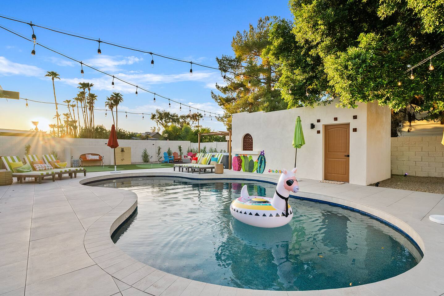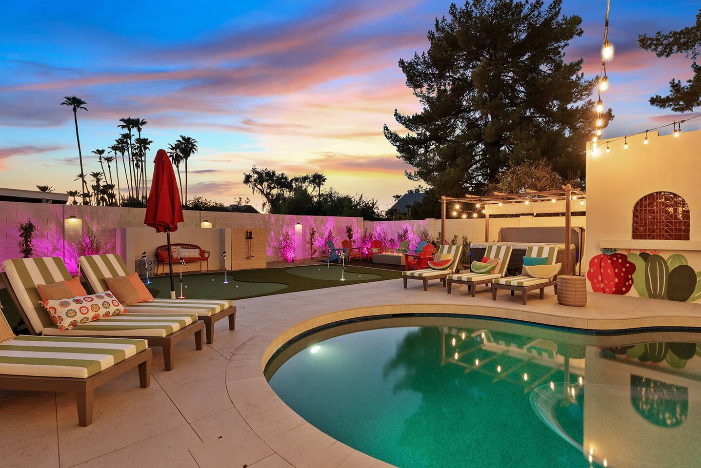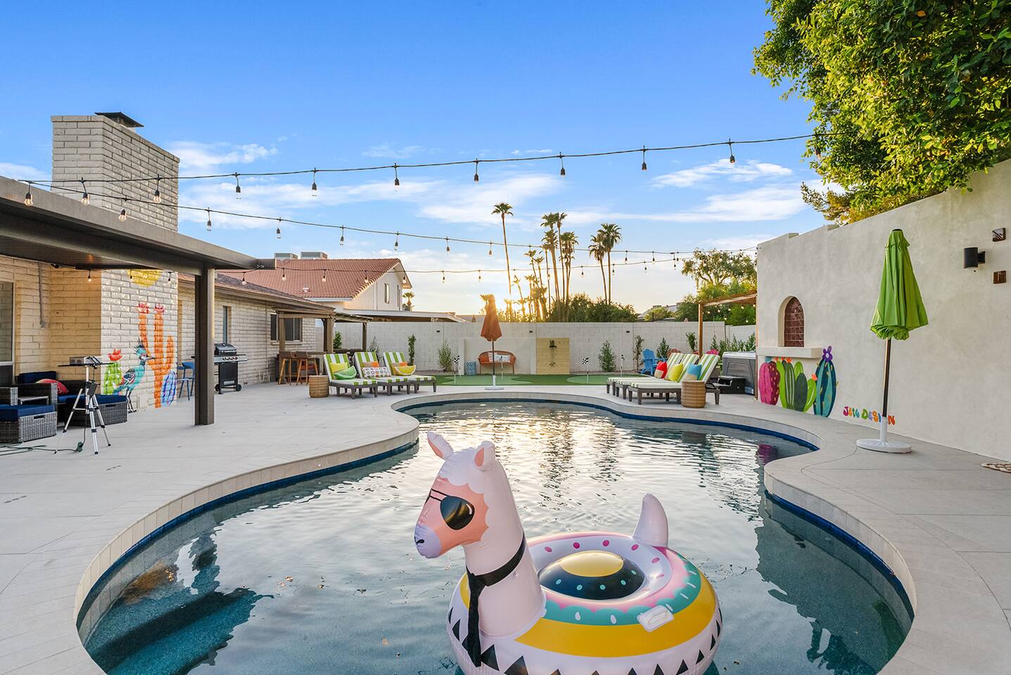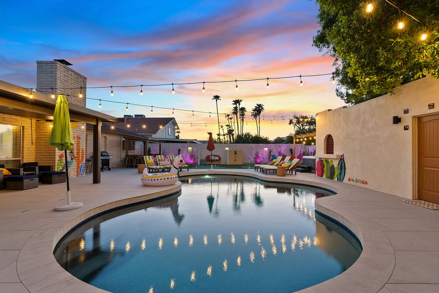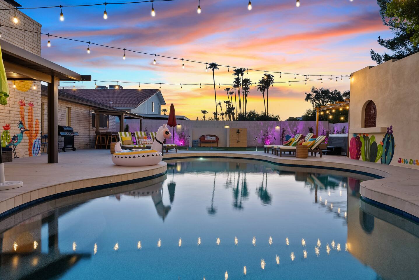 ❤️What Guests Love Most 🌴 Backyard Paradise – Free-heated pool, oversized hot tub, putting green, fire-pit circle with rainbow Adirondacks, & 75" outdoor TV under twinkling bistro lights 🎮 Epic Game Room – Pool table, NBA Jam & Galaga arcades, board-game nook, Smart TV, and a bold wall mural for Insta-worthy pics 🛏 Sleep-Happy Layout – 5 bedrooms (4 kings!) 2 pullout sofas 🍳 Chef-Approved Kitchen – Quartz island, double oven, air fryer, stock-piled spice drawer, & separate coffee/tea bar with Keurig + kettle + pour-over 👶 Travel-Light Perks – High chair, pack ’n play, monitor, kids’ dinnerware & pool toys 📍 Central & Quiet – 20 mins to Scottsdale nightlife, 10–15 mins to Legacy Sports, golf, parks, groceries & wedding venues 🛏 Sleeping Arrangements (Sleeps up to 16) Bedroom 1 – King Bed • ensuite bathroom • sleeper sofa & workspace • Smart TV (sleeps 4) Bedroom 2 – King Bed • Smart TV (sleeps 2) Bedroom 3 – King Bed • Smart TV (sleeps 2) Bedroom 4 – King Bed • Smart TV (sleeps 2) Bedroom 5 – 2 Queen Beds • ensuite bathroom (sleeps 4) Game Room – sleeper sofa (sleeps 2) 🏝 Backyard Highlights Heated, sparkling pool (included) + hot tub BBQ & cactus mural by a local artist Putting green & yard games – cornhole, Giant Connect 4 Fire-pit lounge ringed by colorful chairs for sunset s’mores Shaded patio with a 65" Smart TV & dining for 10 Plenty of umbrellas for mid-day chill 🎯 Game Room & Arcade Full-size pool table NBA Jam + Galaga arcade cabinets Comfy sectional + 65" Smart TV (stream all the things) 🍽 Chef-Ready Kitchen 5-burner range, double oven, air fryer & microwave Large island (seats 3) + dining table (seats 8) under woven pendants Keurig, drip pot, pour-over, frother & starter pods/tea Full spice library, oils, quality knives & kid-safe dinnerware Walk-in pantry stocked with blender, slow cooker, Instant Pot, air fryer & more 📍 Location, Location 25 mins → Legacy Sports Complex & wedding venues 15 mins → Downtown Gilbert eateries & craft brews 20 mins → Old Town Scottsdale nightlife & shopping Groceries, parks, hiking & golf ≤ 5 mins 👋 Good to Know Superhost-level comms & local tips Gig-speed Wi-Fi & Smart TVs everywhere In-home laundry, iron, detergent & supplies Driveway + easy street parking (no garage access) No pets, parties, or indoor smoking — quiet hours 10 pm–7 am