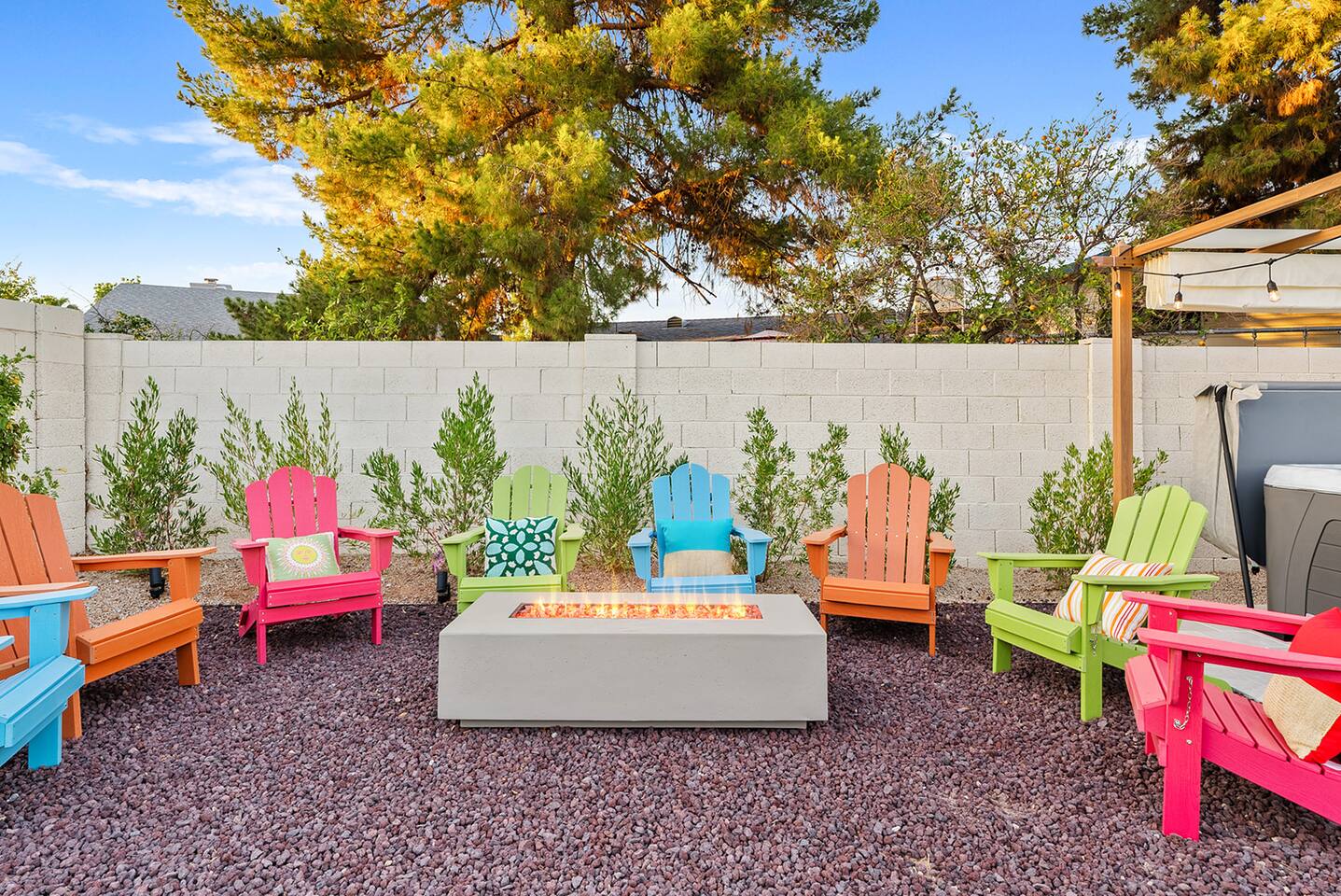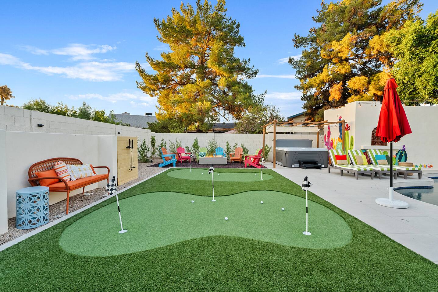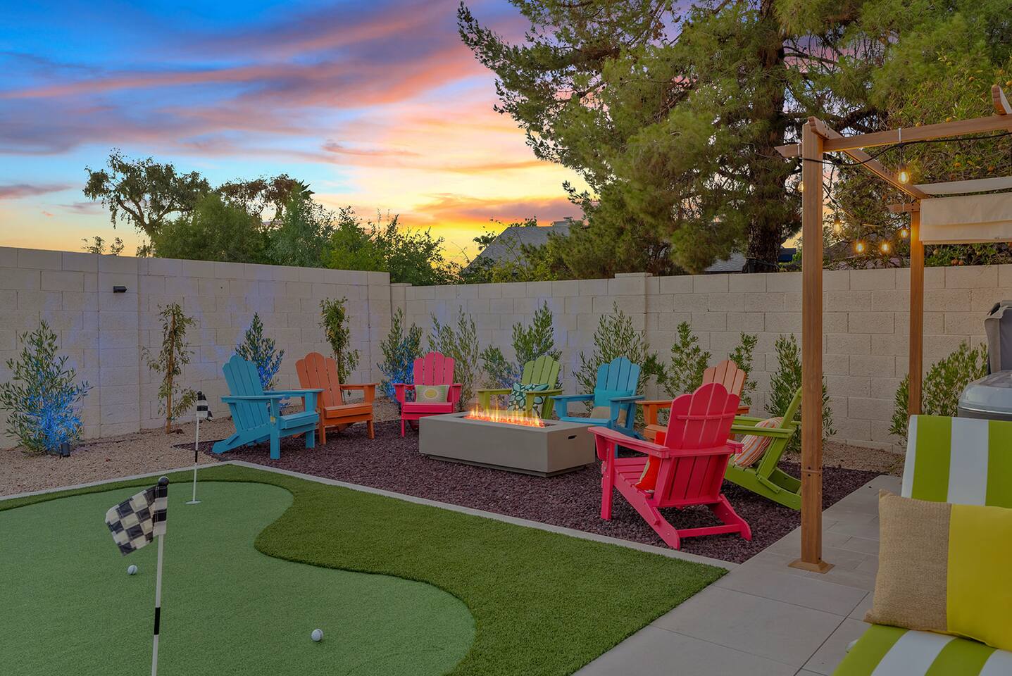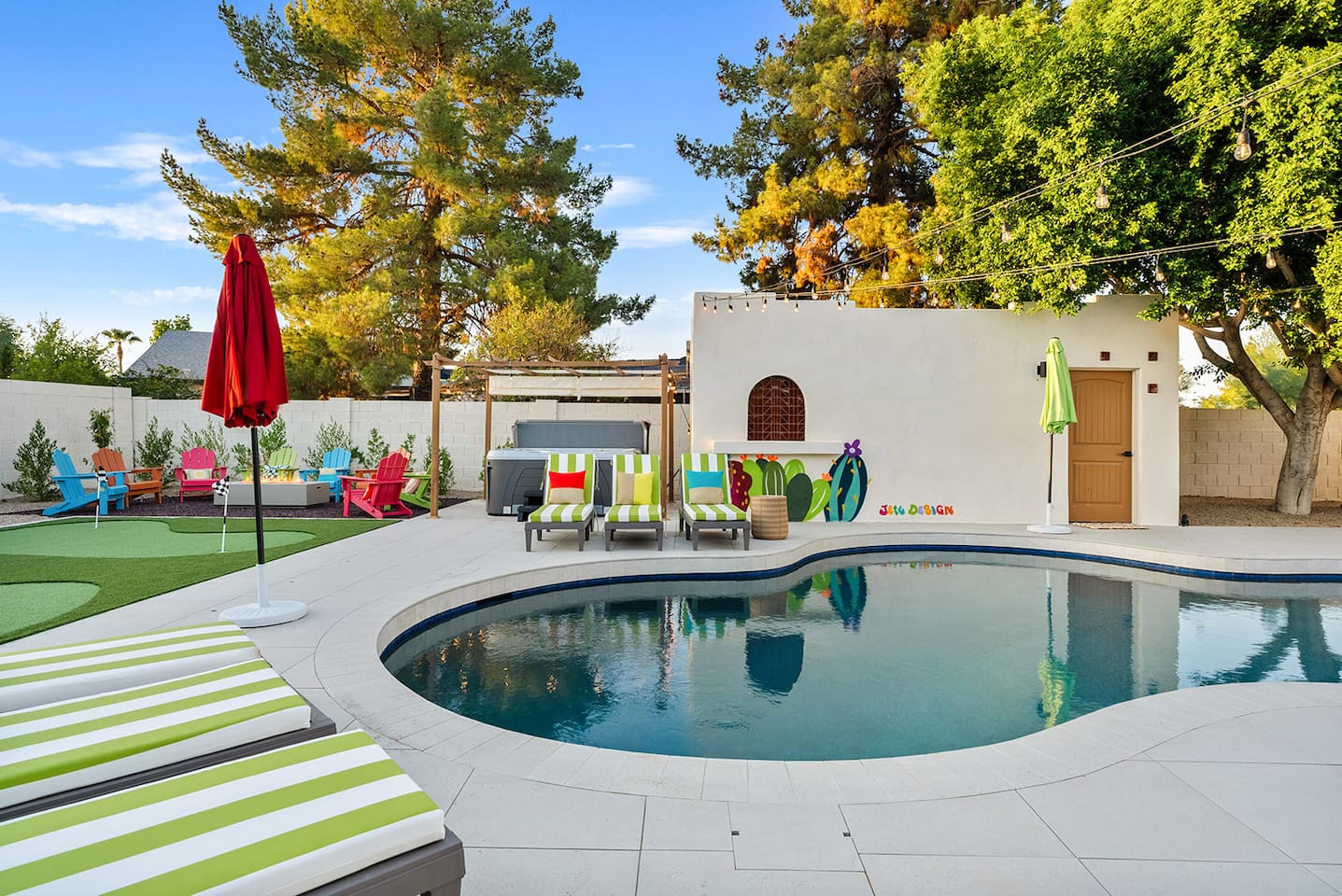 ❤️What Guests Love Most 🌴 Backyard Paradise – Free-heated pool, oversized hot tub, putting green, fire-pit circle with rainbow Adirondacks, & 75" outdoor TV under twinkling bistro lights 🎮 Epic Game Room – Pool table, NBA Jam & Galaga arcades, board-game nook, Smart TV, and a bold wall mural for Insta-worthy pics 🛏 Sleep-Happy Layout – 5 bedrooms (4 kings!) 2 pullout sofas 🍳 Chef-Approved Kitchen – Quartz island, double oven, air fryer, stock-piled spice drawer, & separate coffee/tea bar with Keurig + kettle + pour-over 👶 Travel-Light Perks – High chair, pack ’n play, monitor, kids’ dinnerware & pool toys 📍 Central & Quiet – 20 mins to Scottsdale nightlife, 10–15 mins to Legacy Sports, golf, parks, groceries & wedding venues 🛏 Sleeping Arrangements (Sleeps up to 16) Bedroom 1 – King Bed • ensuite bathroom • sleeper sofa & workspace • Smart TV (sleeps 4) Bedroom 2 – King Bed • Smart TV (sleeps 2) Bedroom 3 – King Bed • Smart TV (sleeps 2) Bedroom 4 – King Bed • Smart TV (sleeps 2) Bedroom 5 – 2 Queen Beds • ensuite bathroom (sleeps 4) Game Room – sleeper sofa (sleeps 2) 🏝 Backyard Highlights Heated, sparkling pool (included) + hot tub BBQ & cactus mural by a local artist Putting green & yard games – cornhole, Giant Connect 4 Fire-pit lounge ringed by colorful chairs for sunset s’mores Shaded patio with a 65" Smart TV & dining for 10 Plenty of umbrellas for mid-day chill 🎯 Game Room & Arcade Full-size pool table NBA Jam + Galaga arcade cabinets Comfy sectional + 65" Smart TV (stream all the things) 🍽 Chef-Ready Kitchen 5-burner range, double oven, air fryer & microwave Large island (seats 3) + dining table (seats 8) under woven pendants Keurig, drip pot, pour-over, frother & starter pods/tea Full spice library, oils, quality knives & kid-safe dinnerware Walk-in pantry stocked with blender, slow cooker, Instant Pot, air fryer & more 📍 Location, Location 25 mins → Legacy Sports Complex & wedding venues 15 mins → Downtown Gilbert eateries & craft brews 20 mins → Old Town Scottsdale nightlife & shopping Groceries, parks, hiking & golf ≤ 5 mins 👋 Good to Know Superhost-level comms & local tips Gig-speed Wi-Fi & Smart TVs everywhere In-home laundry, iron, detergent & supplies Driveway + easy street parking (no garage access) No pets, parties, or indoor smoking — quiet hours 10 pm–7 am