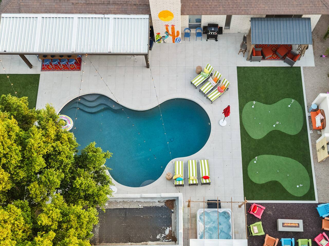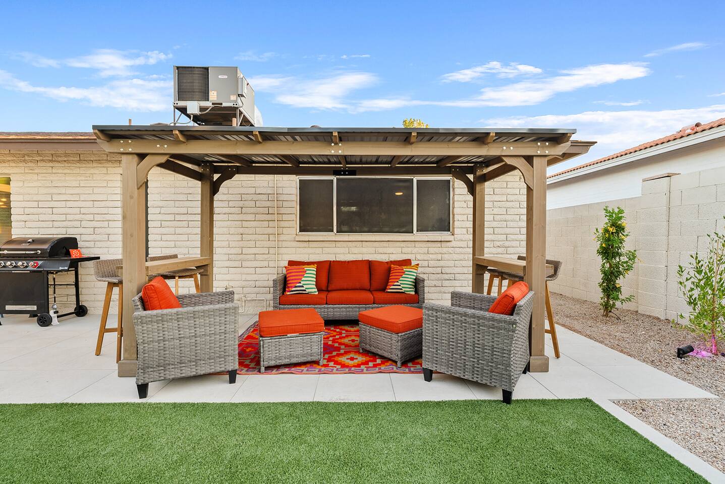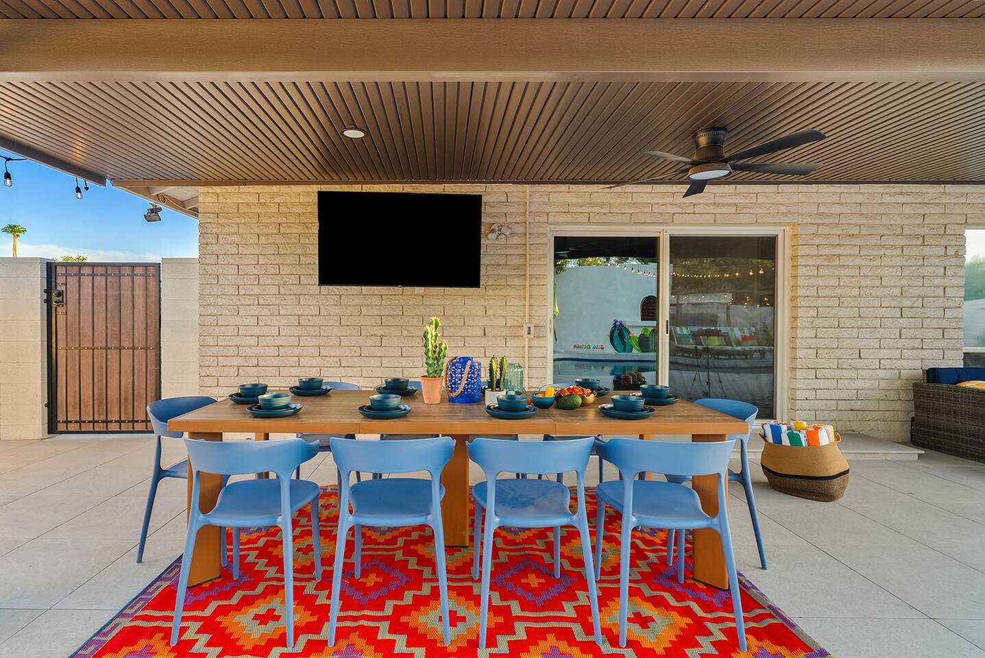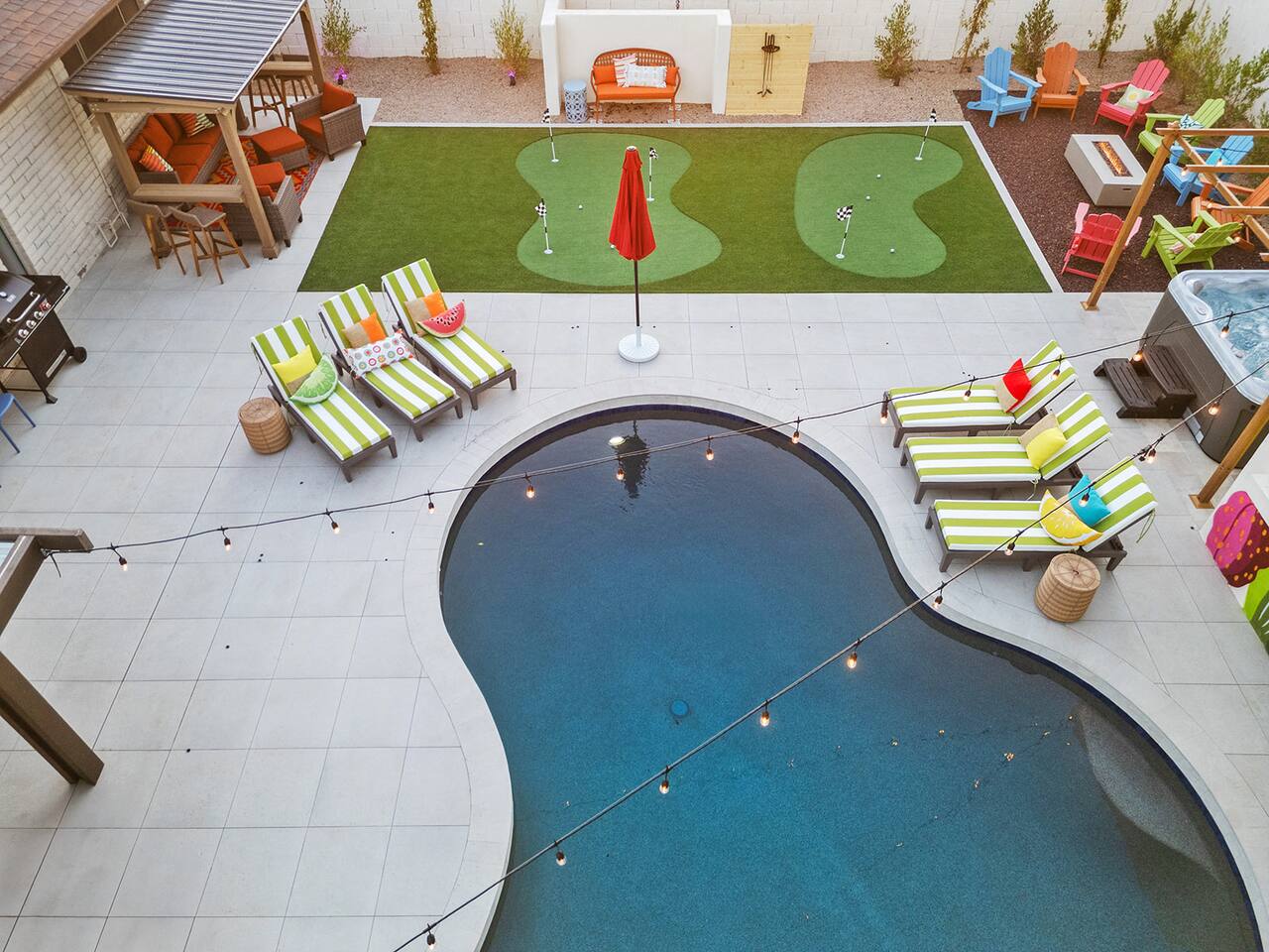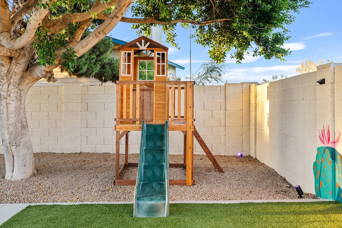 ❤️What Guests Love Most 🌴 Backyard Paradise – Free-heated pool, oversized hot tub, putting green, fire-pit circle with rainbow Adirondacks, & 75" outdoor TV under twinkling bistro lights 🎮 Epic Game Room – Pool table, NBA Jam & Galaga arcades, board-game nook, Smart TV, and a bold wall mural for Insta-worthy pics 🛏 Sleep-Happy Layout – 5 bedrooms (4 kings!) 2 pullout sofas 🍳 Chef-Approved Kitchen – Quartz island, double oven, air fryer, stock-piled spice drawer, & separate coffee/tea bar with Keurig + kettle + pour-over 👶 Travel-Light Perks – High chair, pack ’n play, monitor, kids’ dinnerware & pool toys 📍 Central & Quiet – 20 mins to Scottsdale nightlife, 10–15 mins to Legacy Sports, golf, parks, groceries & wedding venues 🛏 Sleeping Arrangements (Sleeps up to 16) Bedroom 1 – King Bed • ensuite bathroom • sleeper sofa & workspace • Smart TV (sleeps 4) Bedroom 2 – King Bed • Smart TV (sleeps 2) Bedroom 3 – King Bed • Smart TV (sleeps 2) Bedroom 4 – King Bed • Smart TV (sleeps 2) Bedroom 5 – 2 Queen Beds • ensuite bathroom (sleeps 4) Game Room – sleeper sofa (sleeps 2) 🏝 Backyard Highlights Heated, sparkling pool (included) + hot tub BBQ & cactus mural by a local artist Putting green & yard games – cornhole, Giant Connect 4 Fire-pit lounge ringed by colorful chairs for sunset s’mores Shaded patio with a 65" Smart TV & dining for 10 Plenty of umbrellas for mid-day chill 🎯 Game Room & Arcade Full-size pool table NBA Jam + Galaga arcade cabinets Comfy sectional + 65" Smart TV (stream all the things) 🍽 Chef-Ready Kitchen 5-burner range, double oven, air fryer & microwave Large island (seats 3) + dining table (seats 8) under woven pendants Keurig, drip pot, pour-over, frother & starter pods/tea Full spice library, oils, quality knives & kid-safe dinnerware Walk-in pantry stocked with blender, slow cooker, Instant Pot, air fryer & more 📍 Location, Location 25 mins → Legacy Sports Complex & wedding venues 15 mins → Downtown Gilbert eateries & craft brews 20 mins → Old Town Scottsdale nightlife & shopping Groceries, parks, hiking & golf ≤ 5 mins 👋 Good to Know Superhost-level comms & local tips Gig-speed Wi-Fi & Smart TVs everywhere In-home laundry, iron, detergent & supplies Driveway + easy street parking (no garage access) No pets, parties, or indoor smoking — quiet hours 10 pm–7 am