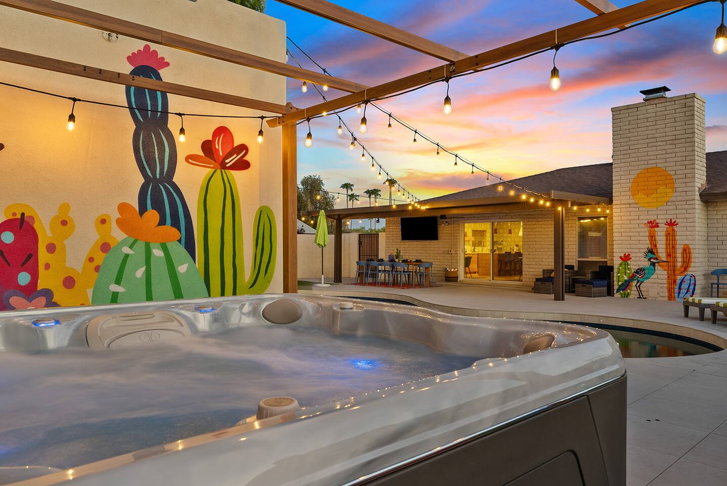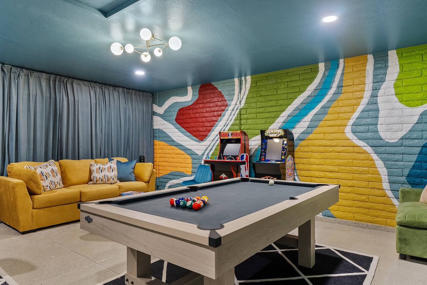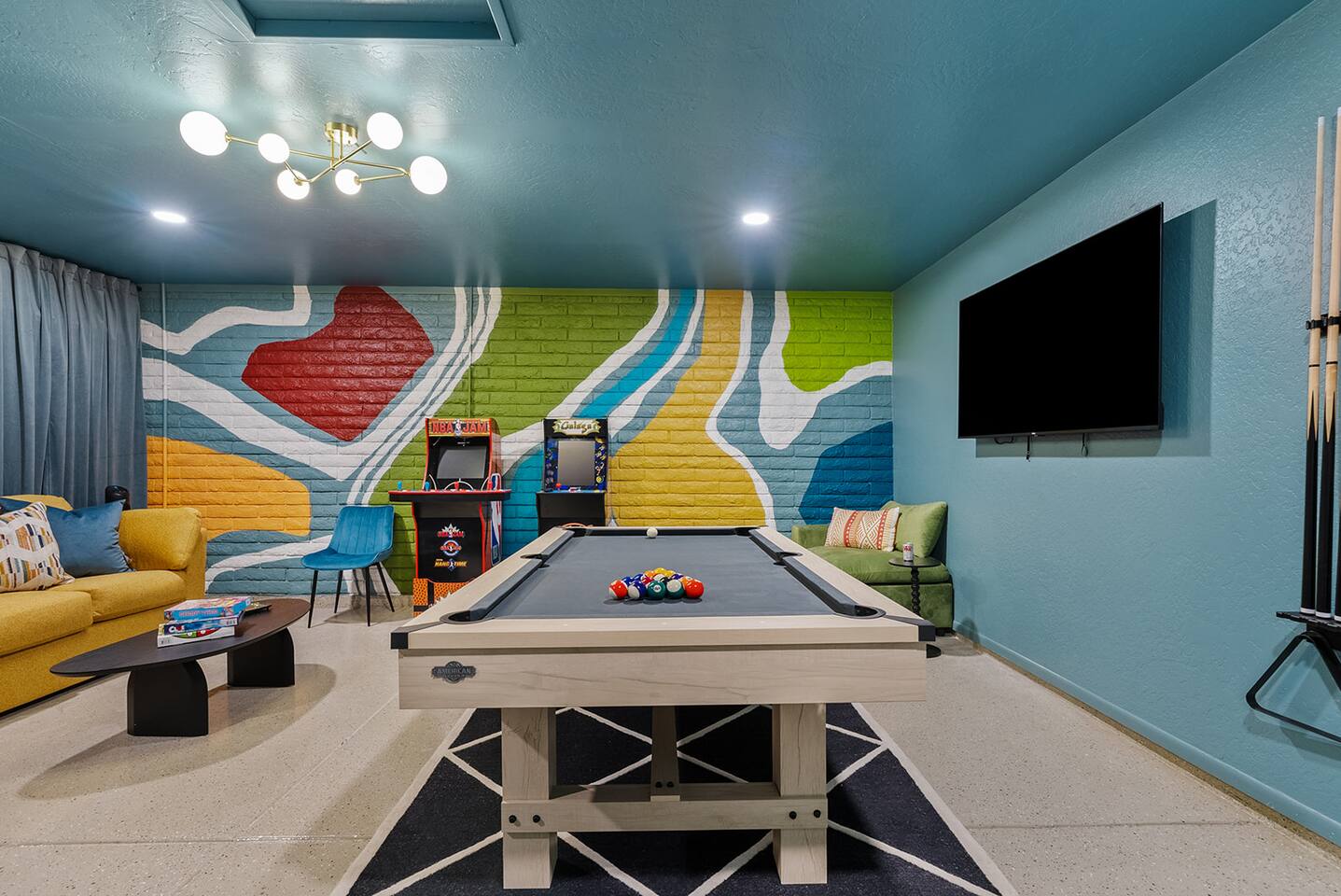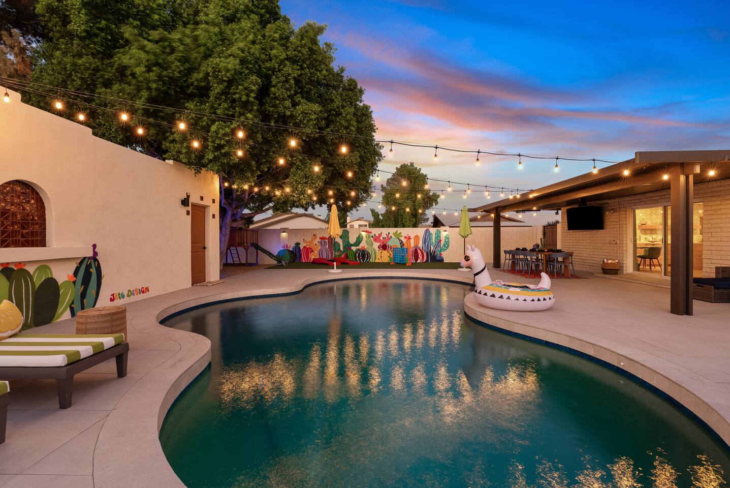🌵 The Oasis – Mesa’s Color-Splashed Cactus Retreat From the hand-painted cactus fireplace to the resort-style backyard, this 5-bed | 3-bath home is made for memory-making. Spread out, reconnect, and let every generation claim a favorite hang-out. Whether that’s the chef’s kitchen, the heated pool framed by string lights, or the muraled arcade-packed game room.