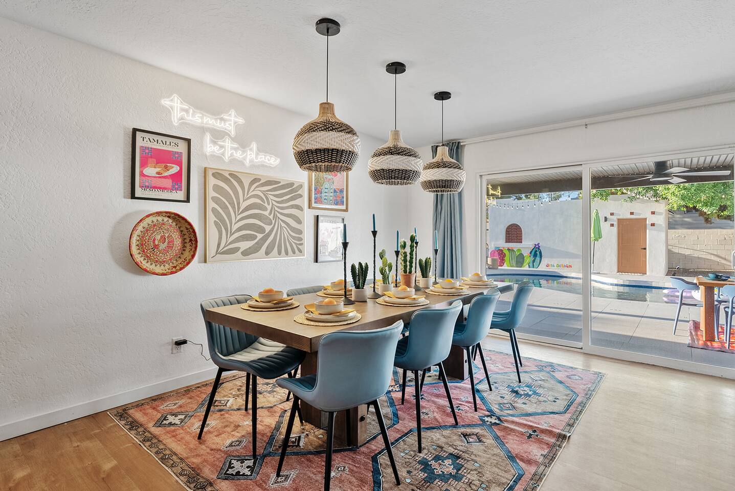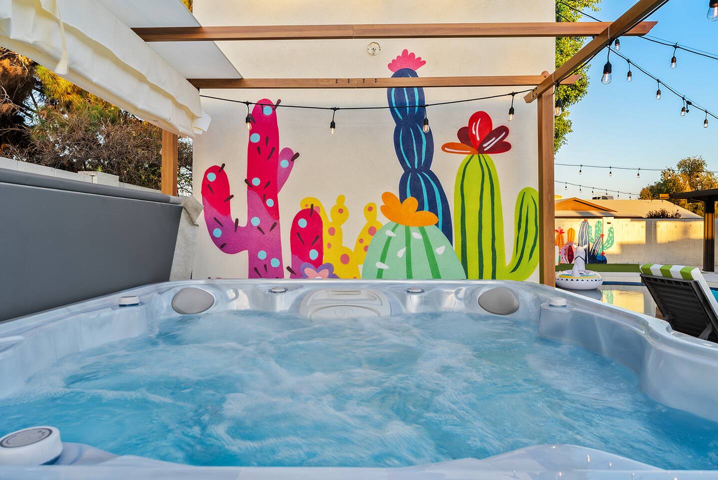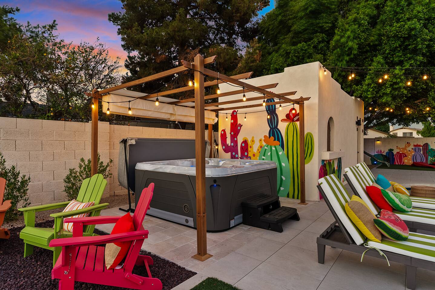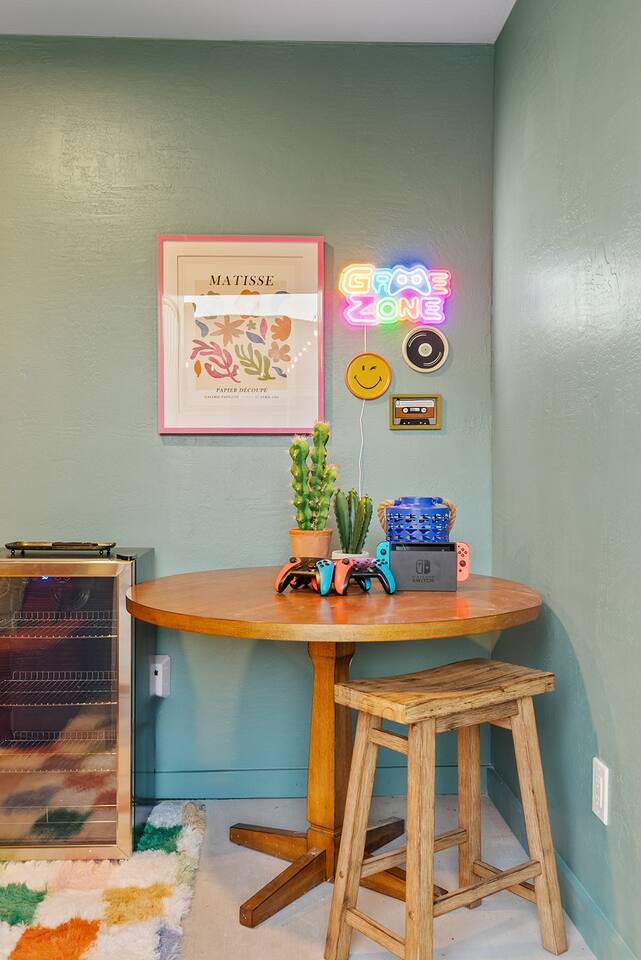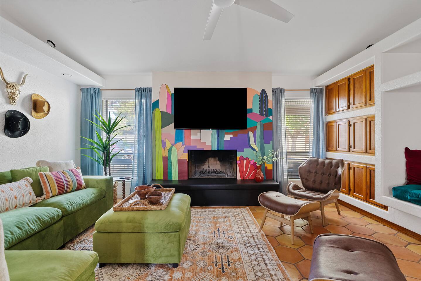 🌵 The Oasis – Mesa’s Color-Splashed Cactus Retreat From the hand-painted cactus fireplace to the resort-style backyard, this 5-bed | 3-bath home is made for memory-making. Spread out, reconnect, and let every generation claim a favorite hang-out. Whether that’s the chef’s kitchen, the heated pool framed by string lights, or the muraled arcade-packed game room.